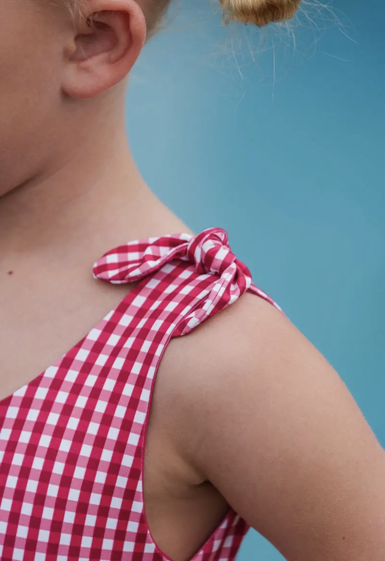 This red gingham one-piece swimsuit is a timeless summer staple. Designed with a simple silhouette and soft UPF 50+ fabric , it offers comfort and sun protection for pool days , beach afternoons , and everything in between. Easy , classic , and made for real summer wear. ALL SWIM IS FINAL SALE!!!
