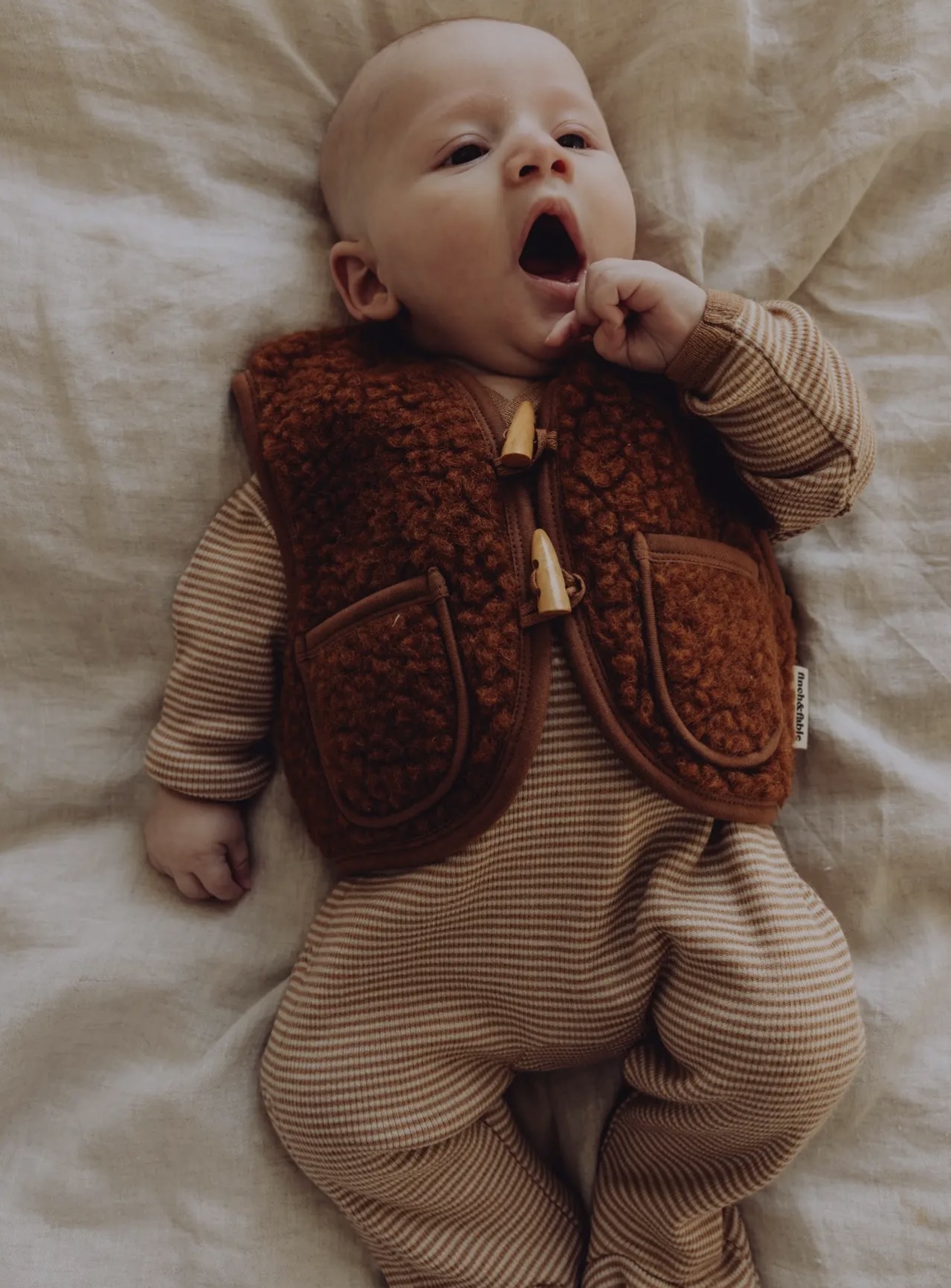 Wrap your little one in this luxuriously soft wool sherpa for an added layer of warmth , inside or outside the house. Wool sherpa vest with toggle button closure. A beautiful piece that complements any outfit. *naturally hypoallergenic *80% merino wool *20% recycled polyester Do not tumble dry!