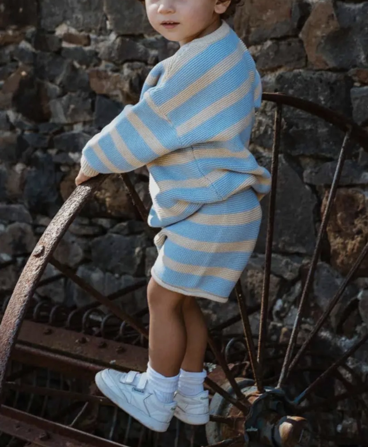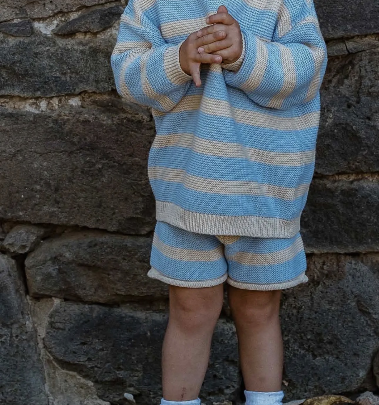 Our Cotton Knit Shorts in Sky Stripe features a roll hem, garter knitting in medium weight. These shorts are breathable and perfect for little ones who run hot. Made from stretchy and buttery soft 100% cotton yarn, they also feature an adjustable waist drawstring. Wear it with our Knit Jumpers in Bluebell Jacquard or Sky stripe. You can also mix and match this style with other pieces to coordinated with the entire family.