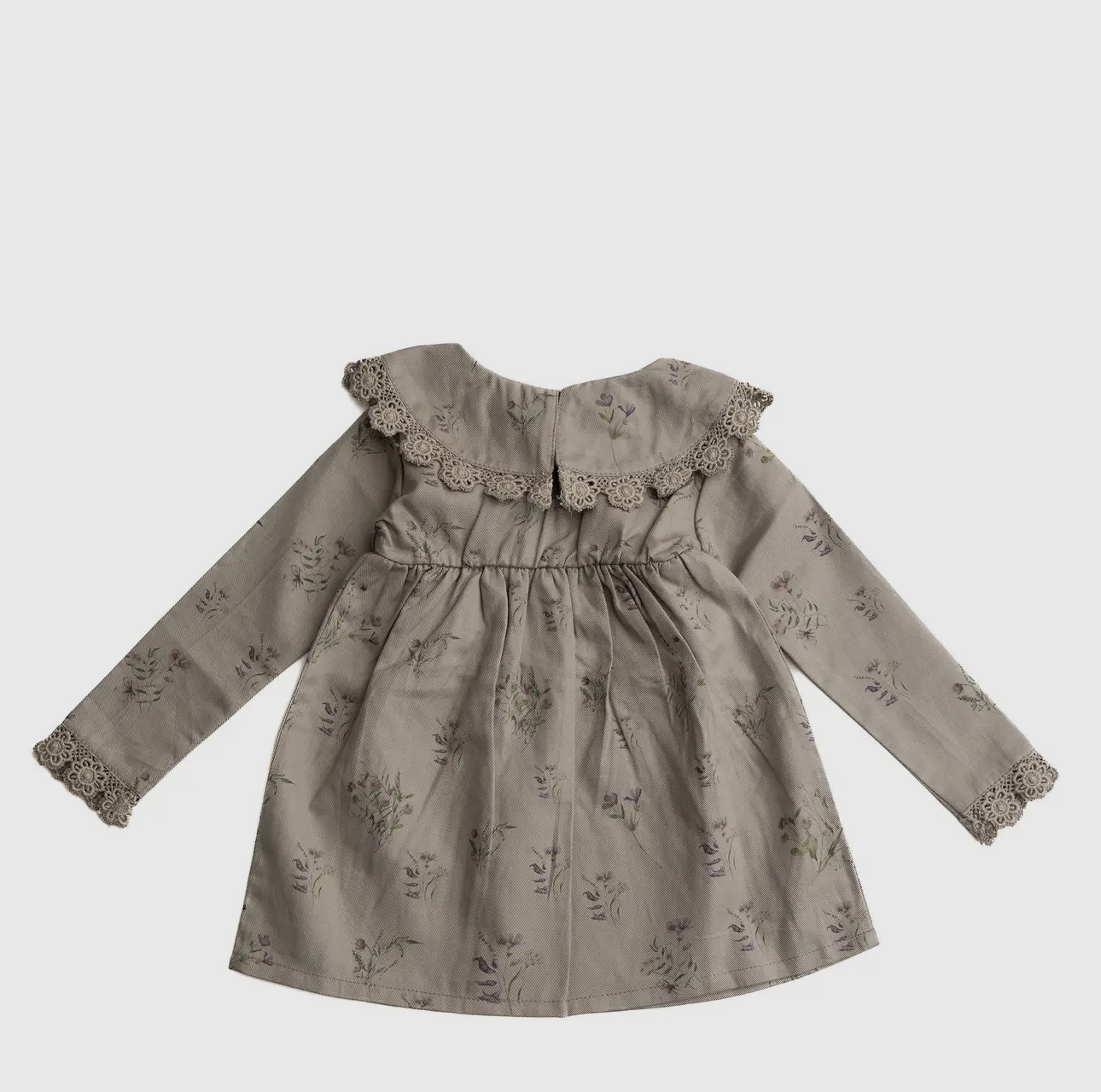 Dress for the little ones in a warm gray color with purple flowers. Fine lace is sewn on all edges. Made of durable, high-quality 100% cotton. Do not tumble dry Do not bleach Lay flat to dry