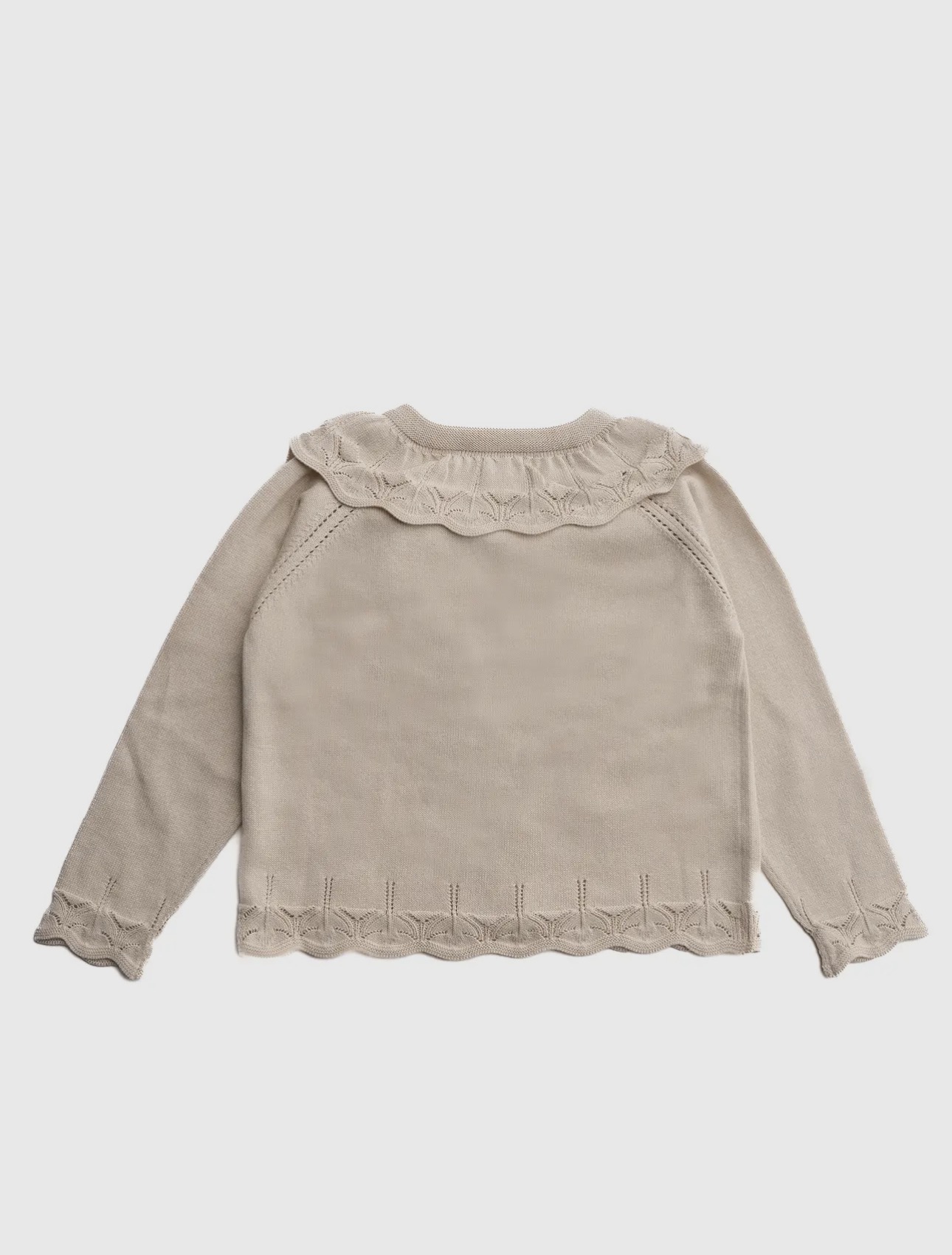 Nice cardigan in a cream shade. The cardigan has a nice lace collar. There is lace in the sleeves and bottom of the shirt. The shirt is made of a durable, buttery soft, high quality 100% organic cotton. Do not tumble dry Do not bleach must lie flat and dry.