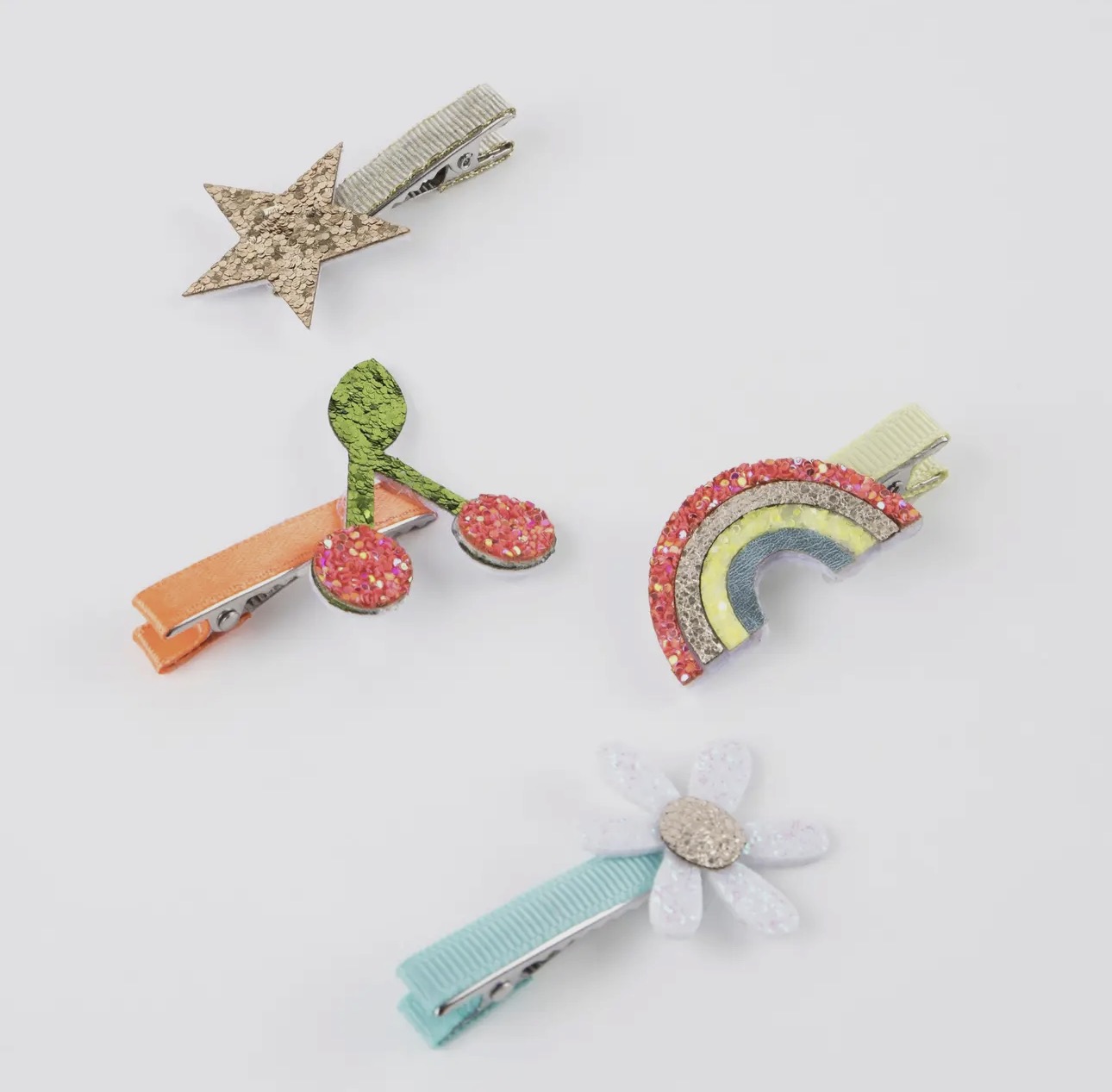 Meri Meri * set of 8 in 8 designs * chunky and fine glitter fabrics backed with cream felt * silver tone crocodile clip