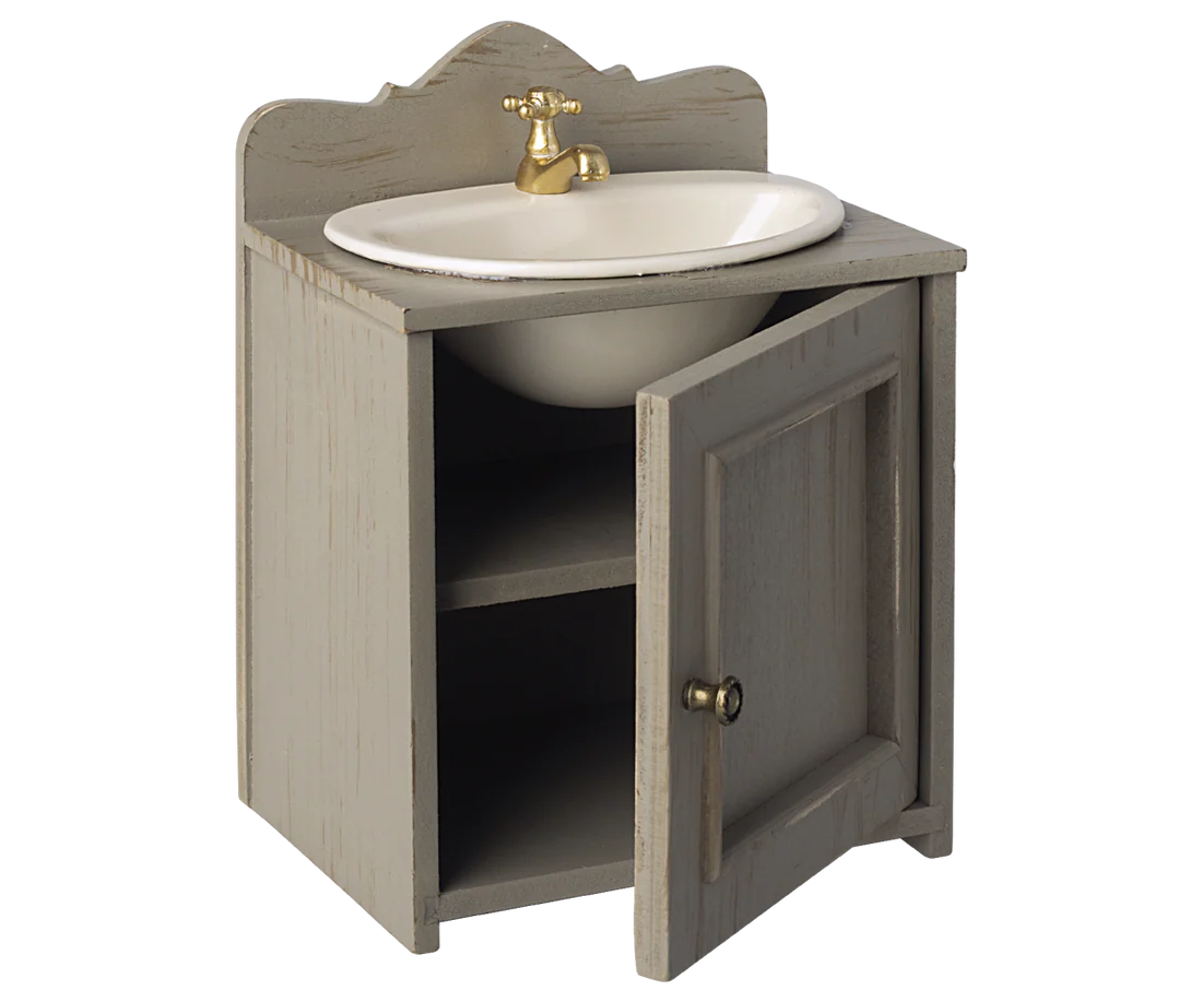 A beautiful vintage metal sink with a golden water tap. The sink comes in a wooden closet which has the most beautiful paint details and fullfill the old vintage look in the dollhouse.