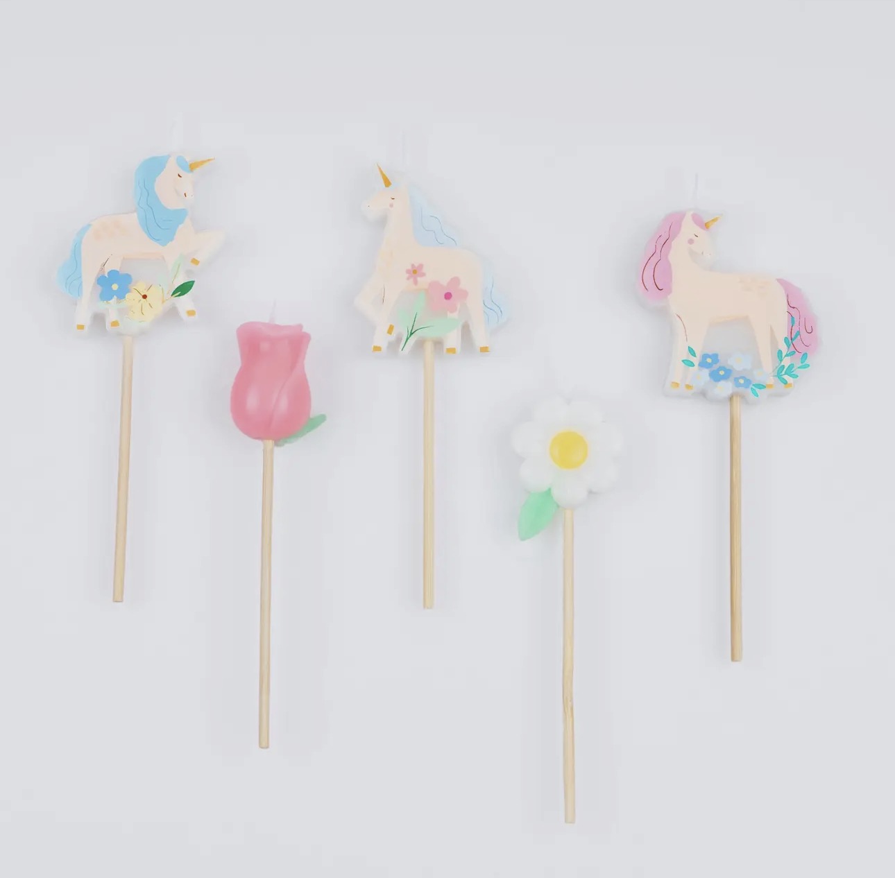 Meri Meri * 5 wax candle set , with 3 unicorns , a rose and a daisy * wooden sticks to easily insert into a cake or cupcake