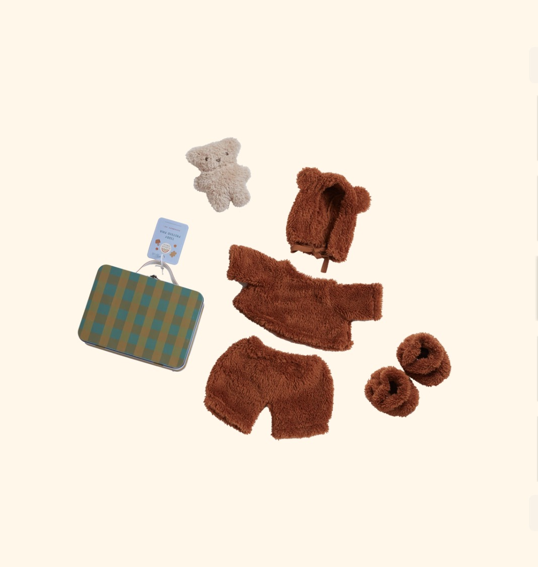 This set comes packaged in a collectible metal tin suitcase with a vegan leather handle. It includes a plush teddy bonnet with sweet little ears , matching jacket , pants , and booties that make them oh so snuggly. these pretend packs are designed to roam wherever play ,may go.