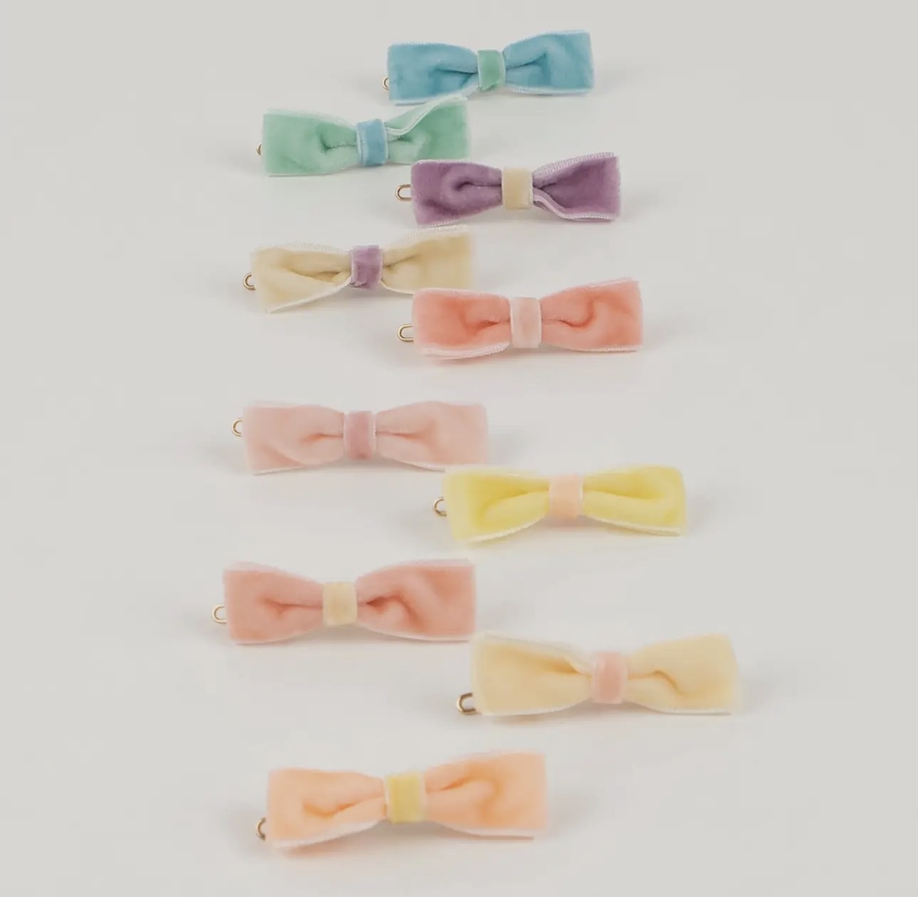 The bows are crafted from velvet ribbons in pale yellow , dusty lilac , mint , pale peach , peach , ivory blue , pale pink , and dusty pink
