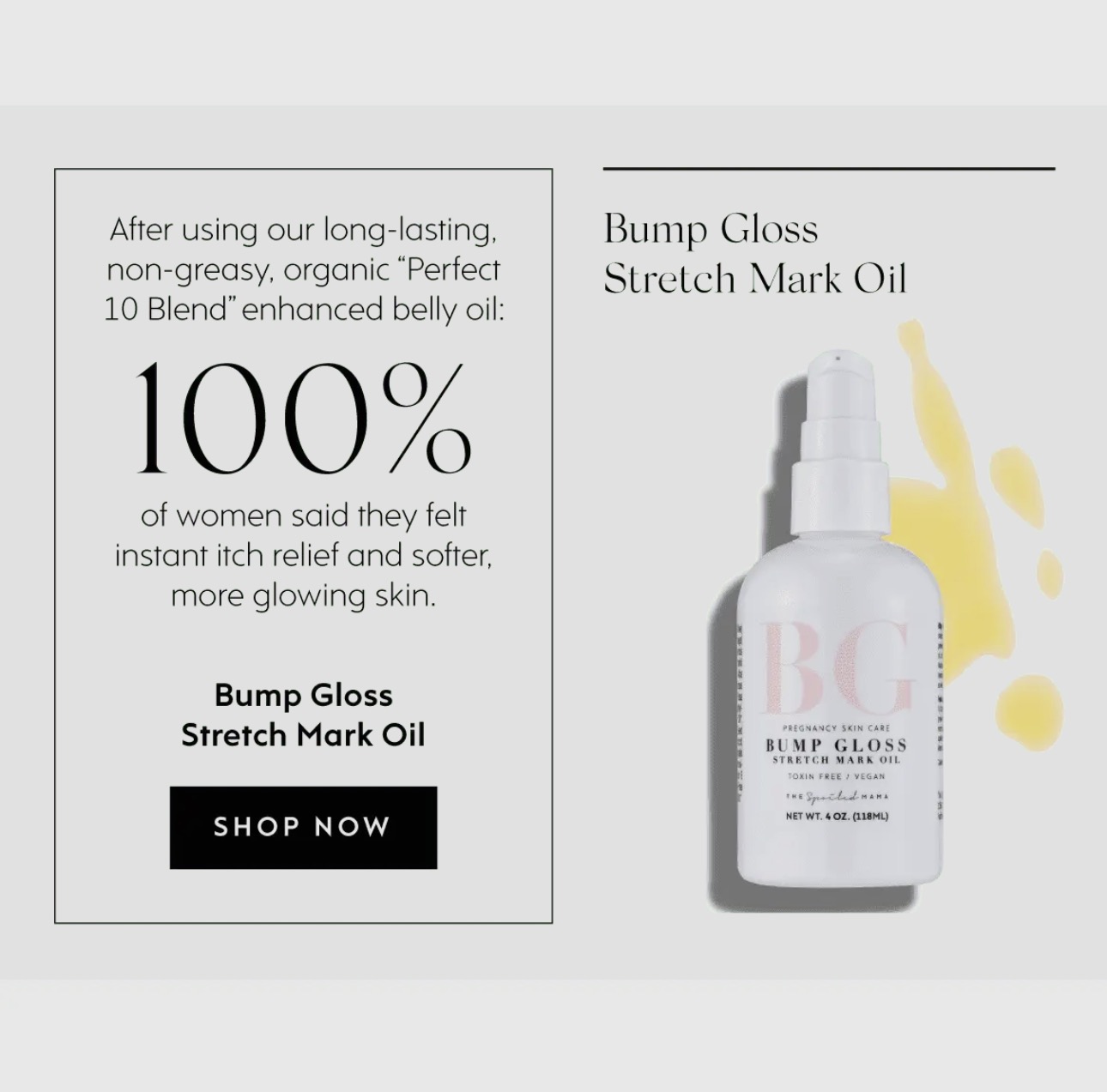 This bumb gloss pregnancy stretch mark oil soothes your itchy tummy and keeps it stretch mark free with its organic "Perfect 10 blend". The perfect 10 blend is a unique blend of ten cold-pressed oils that add major hydration and increases skin elasticity to your growing belly. Enhanced with shea butter , olive oil , and vitamin E oil for stretch marks , this long lasting belly oil for dry skin and stretch marks is a fast-absorbing treatment rich in antioxidants and collagen- building components.