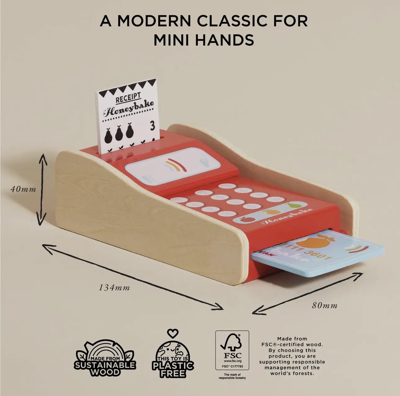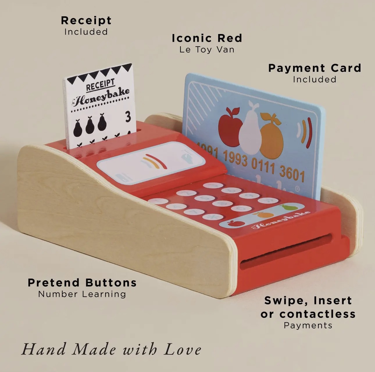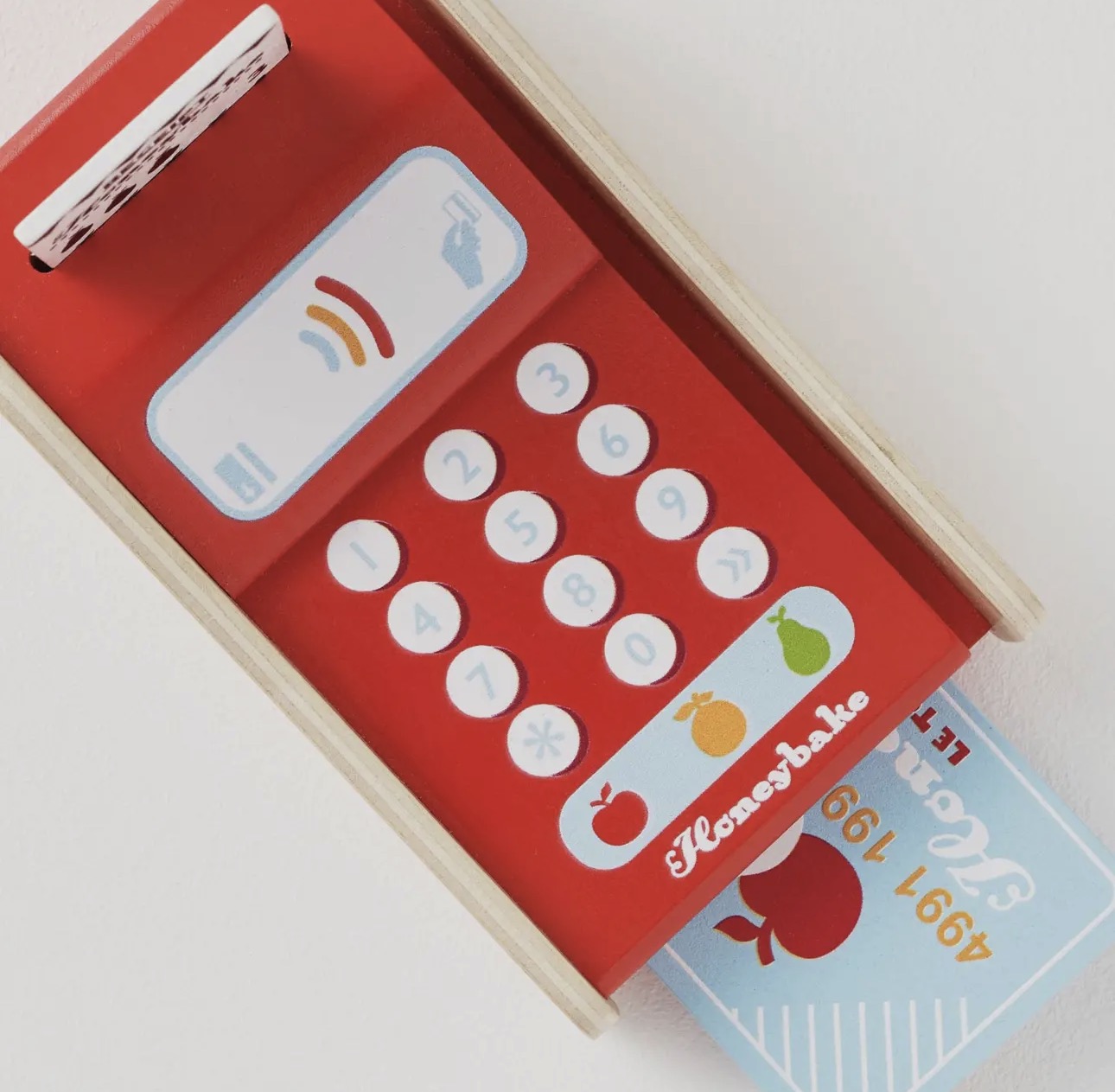 Let's go shopping! This adorable, brightly painted wooden card machine toy comes complete with a receipt and payment card. This educational toy presents a great way to teach children numeracy while having fun.